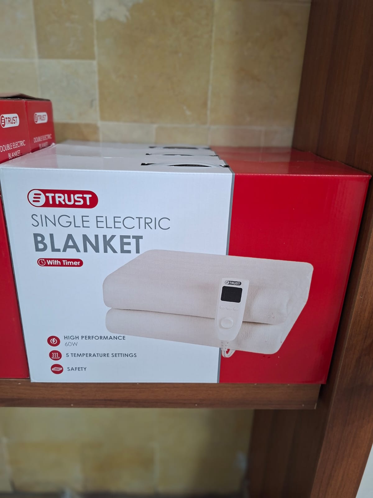 هذه بطانية كهربائية مفردة من ماركة Trust. تتميز البطانية بالخصائص التالية: القدرة التشغيلية: 60 واط. تحتوي على 5 سخانات. تتميز بنظام حماية من الحرارة الزائدة. تحتوي على وحدة تحكم رقمية بثلاثة مستويات للحرارة. رقم الطراز: 235-50120.