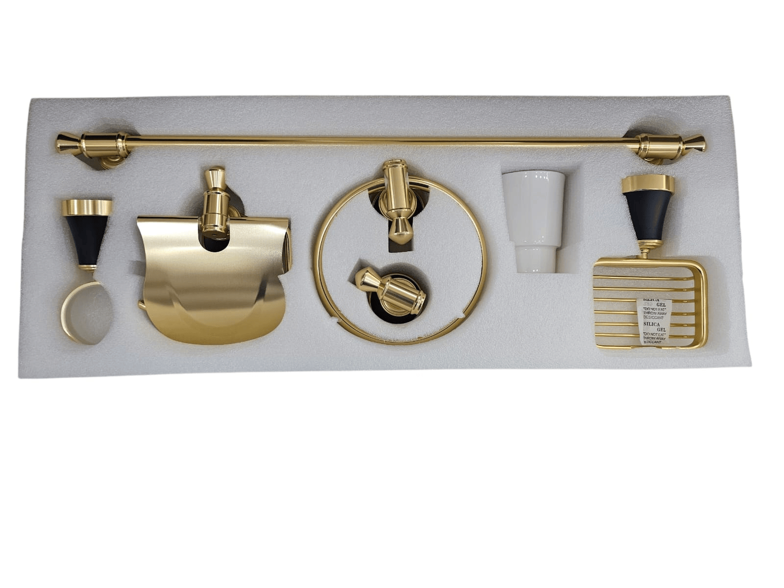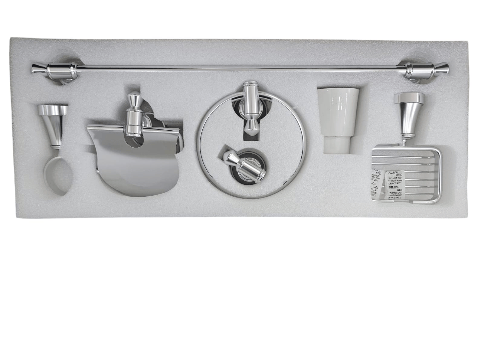 تحتوي المجموعة على قضيب منشفة، وحامل ورق تواليت، وحلقة منشفة، وحامل فرشاة أسنان أو كوب، وحامل صابون.