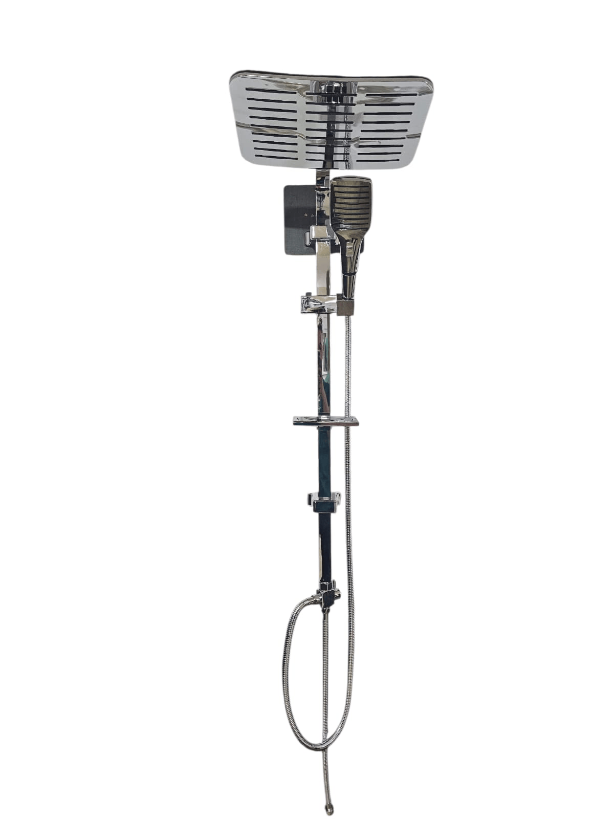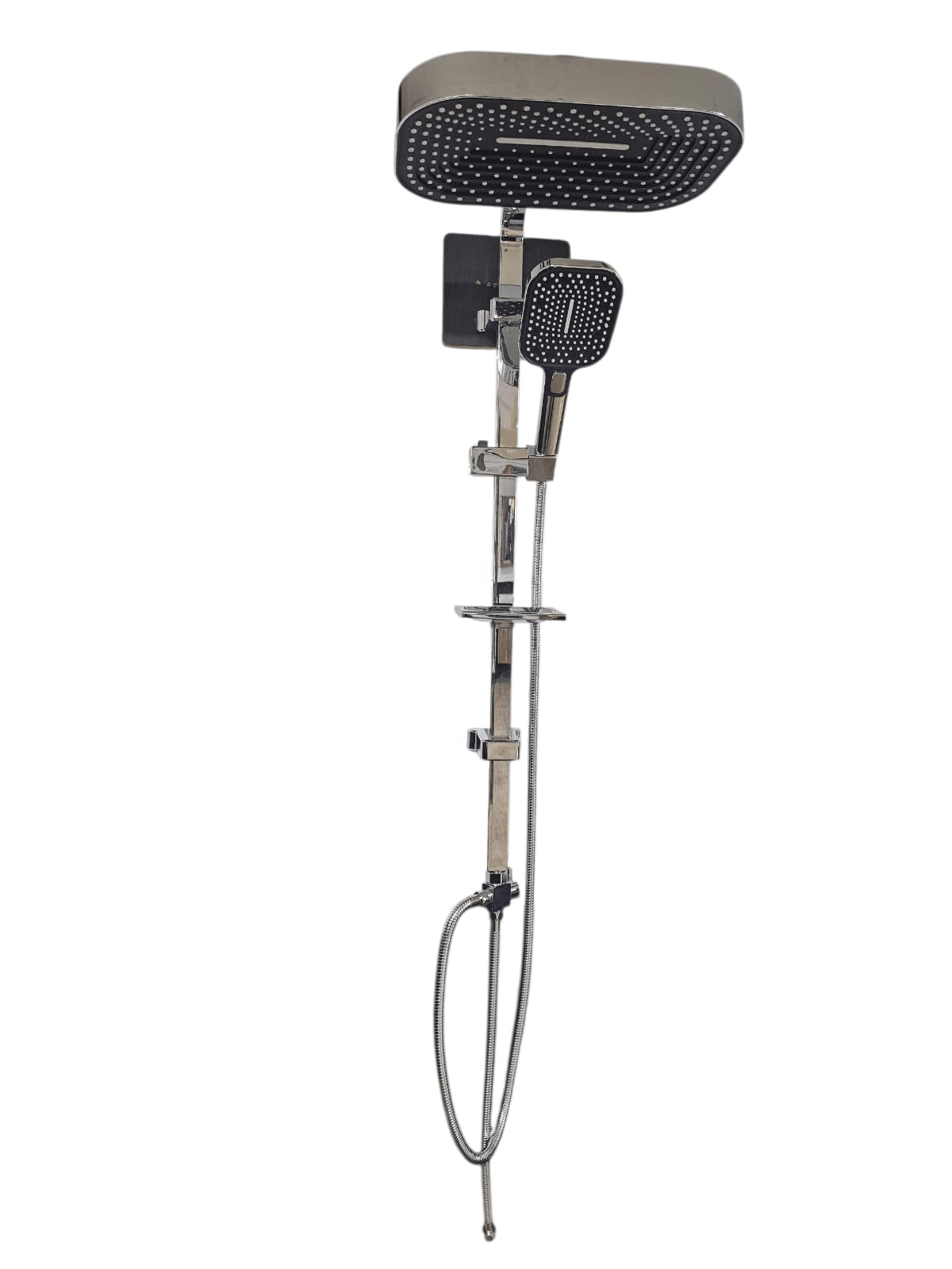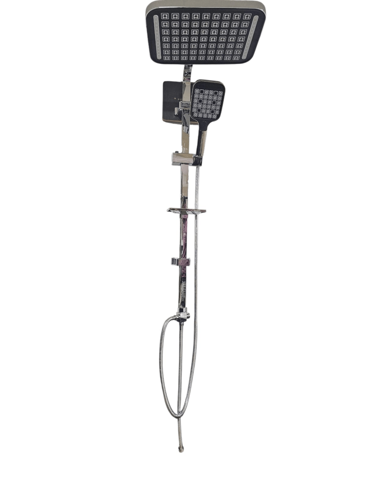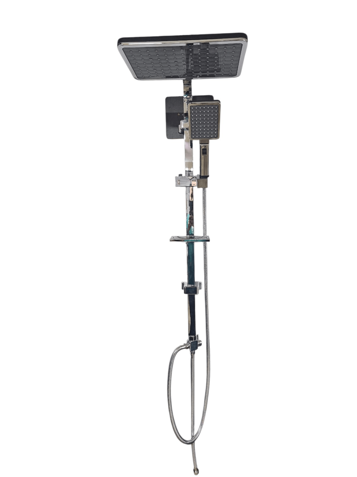 يتضمن النظام رأس دش علوي مربع، ودش يدوي، وعمود دش قابل للتعديل. يحتوي على رف صغير لوضع مستلزمات الاستحمام. يتميز بتصميم كروم لامع، مما يضيف لمسة عصرية للحمام