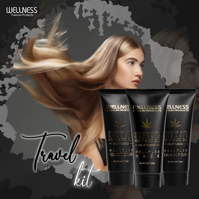 طقم ويلنس للسفر بزيت بذور القنب – شامبو + بلسم + ماسك شعر (3×50 مل)