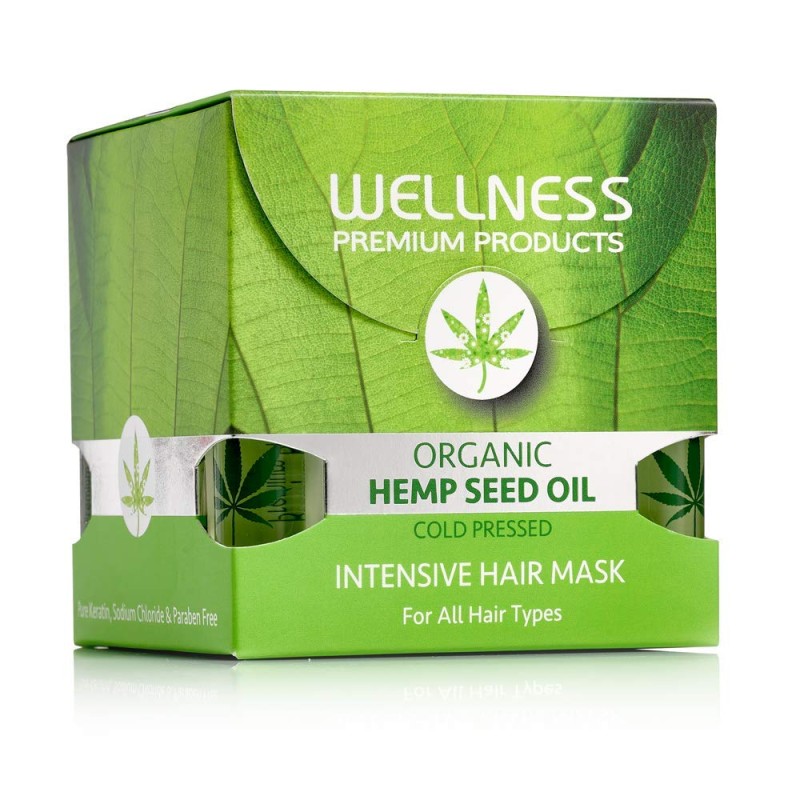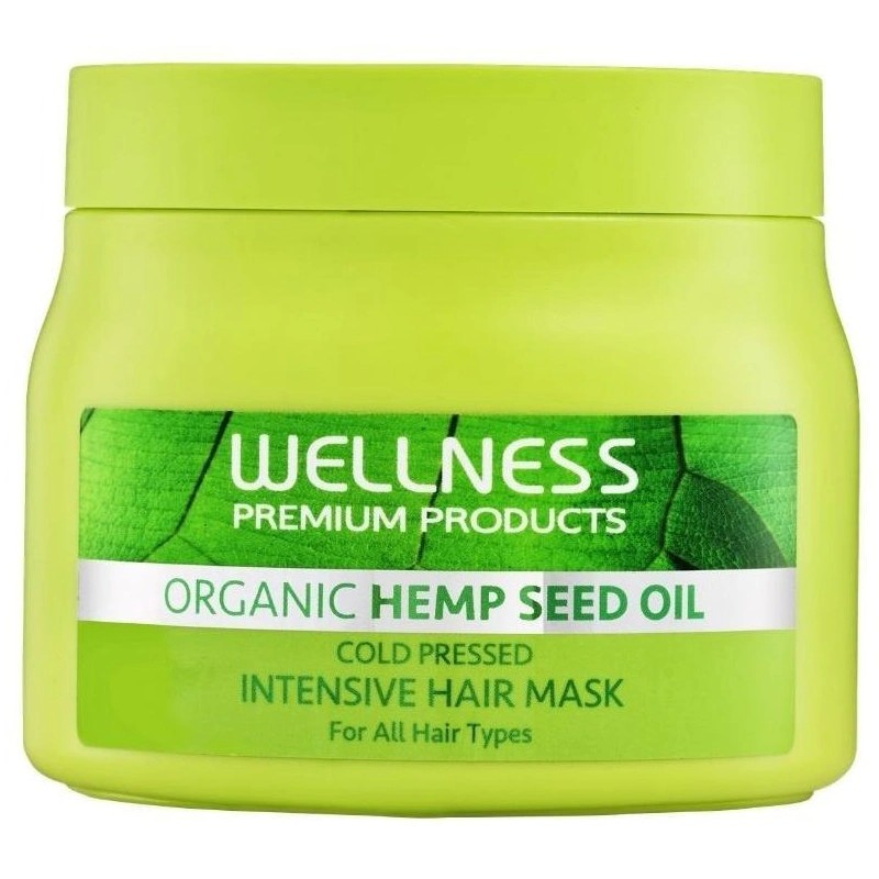 الصورة تُظهر قناع الشعر بزيت بذور القنب العضوي من “ويلنيس بريميوم بروداكتس” (Wellness Premium Products Organic Hemp Seed Oil Hair Mask).